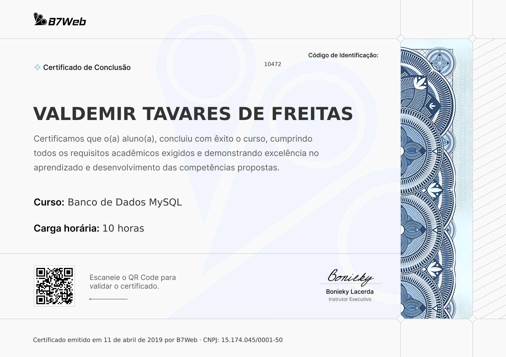 Este certificado foi emitido para Valdemir Tavares De Freitas pela conclusão do curso Banco de Dados MySQL em 11 de abril de 2019.