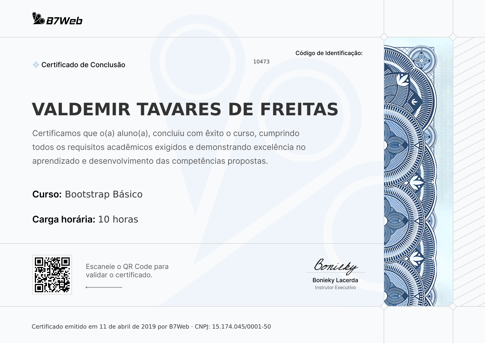Este certificado foi emitido para Valdemir Tavares De Freitas pela conclusão do curso Bootstrap Básico em 11 de abril de 2019.