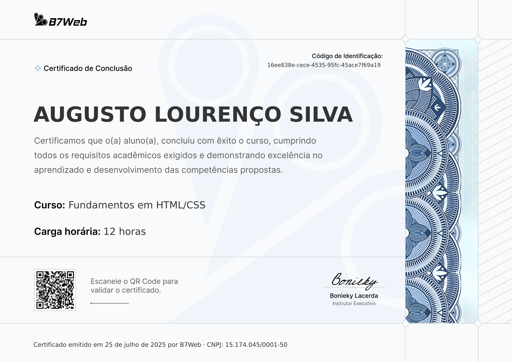 Este certificado foi emitido para Augusto Lourenço Silva pela conclusão do curso Fundamentos em HTML/CSS em 25 de julho de 2025.