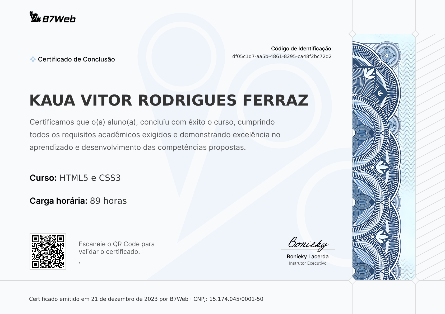 Este certificado foi emitido para KAUA VITOR RODRIGUES FERRAZ pela conclusão do curso HTML5 e CSS3 em 21 de dezembro de 2023.