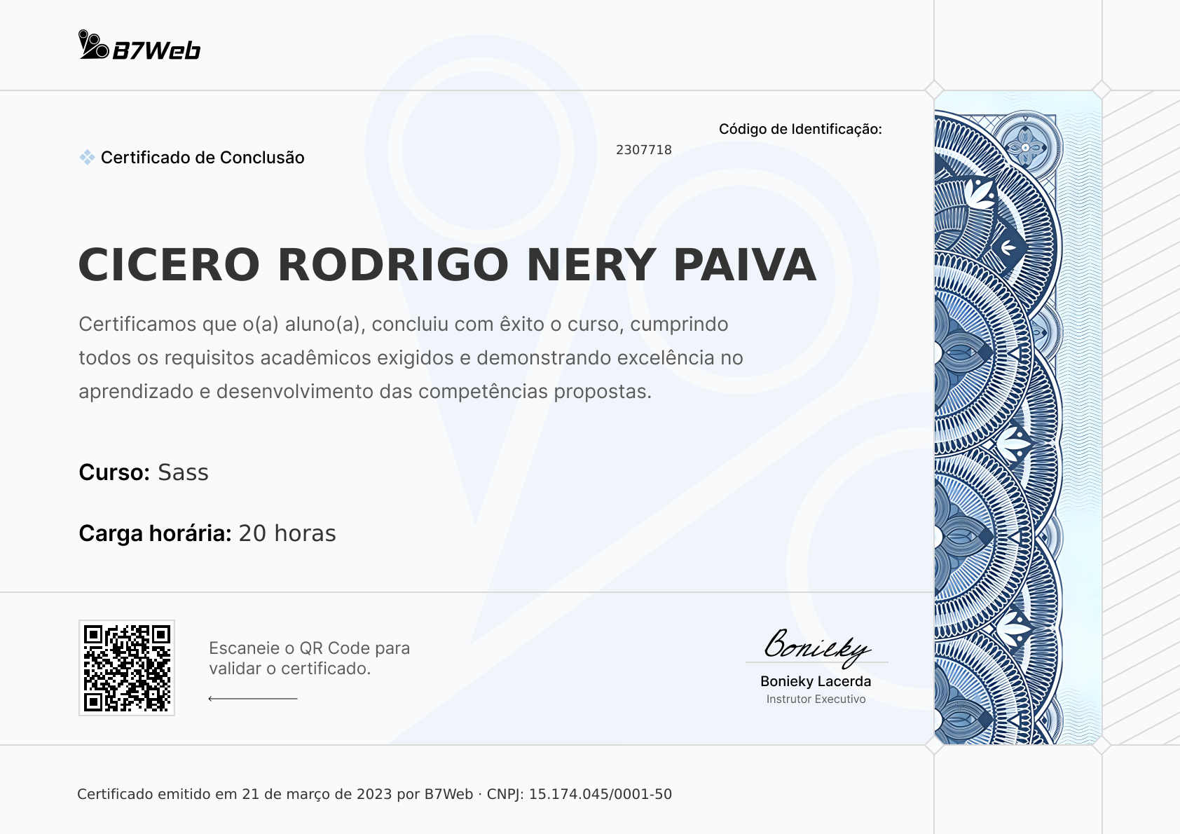 Este certificado foi emitido para Cicero Rodrigo Nery Paiva pela conclusão do curso Sass em 21 de março de 2023.