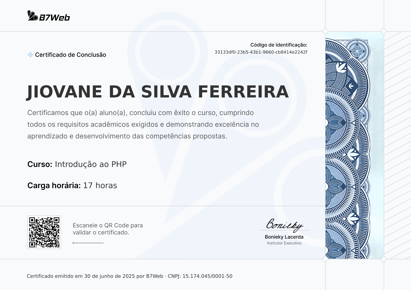 Este certificado foi emitido para Jiovane da Silva Ferreira pela conclusão do curso Introdução ao PHP em 30 de junho de 2025.