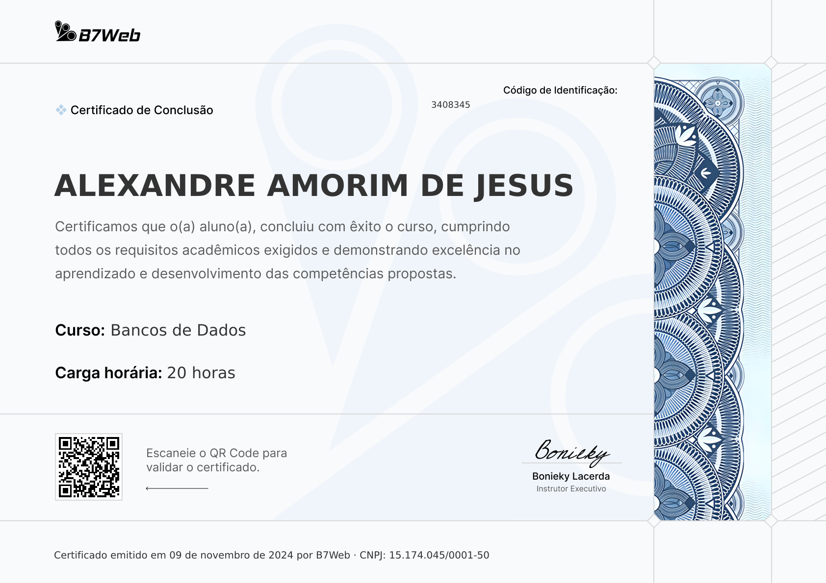 Este certificado foi emitido para Alexandre Amorim de Jesus pela conclusão do curso Bancos de Dados em 09 de novembro de 2024.