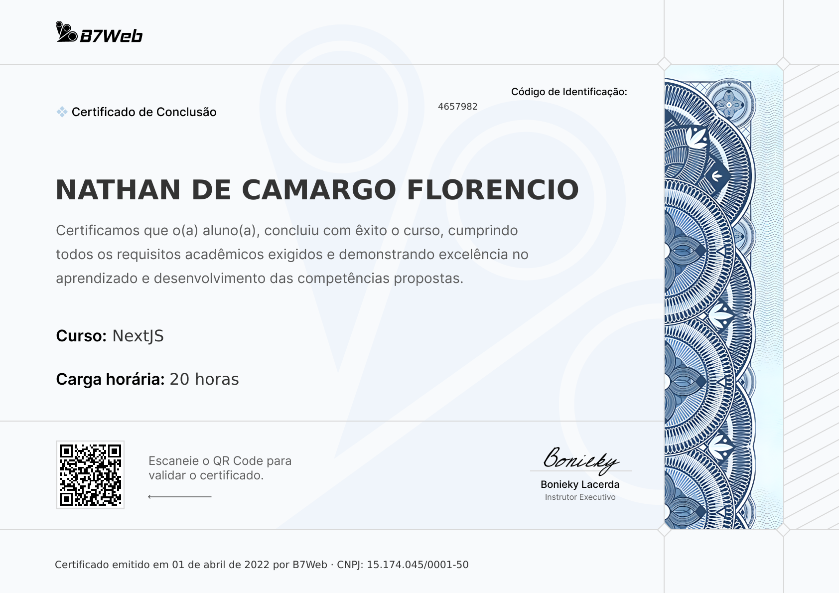 Este certificado foi emitido para Nathan de Camargo Florencio pela conclusão do curso NextJS em 01 de abril de 2022.