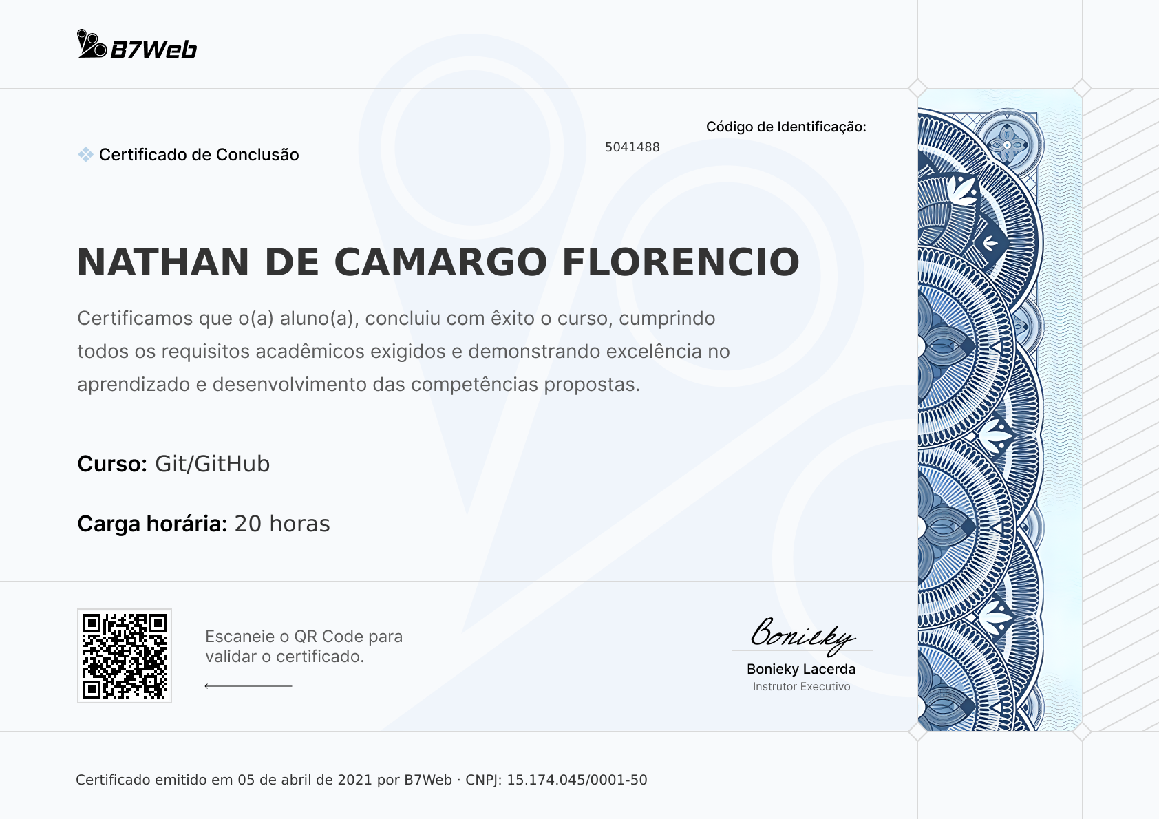 Este certificado foi emitido para Nathan de Camargo Florencio pela conclusão do curso Git/GitHub em 05 de abril de 2021.