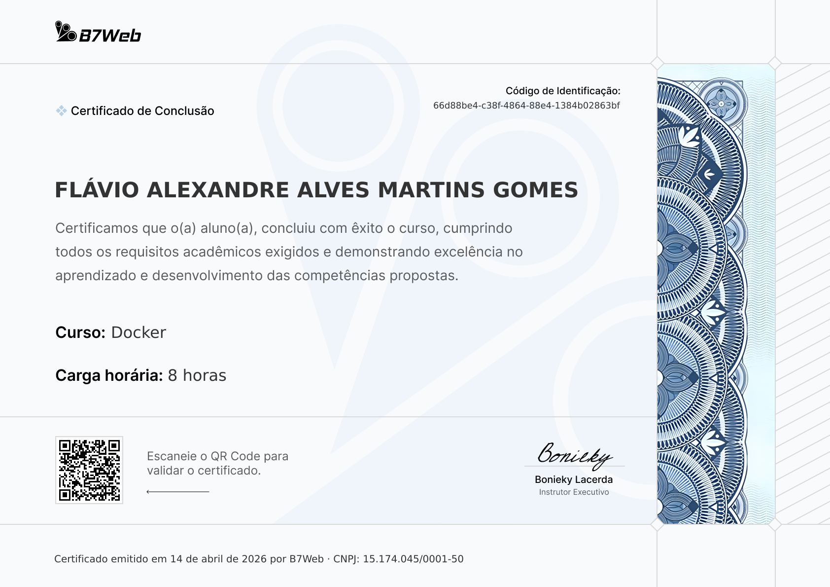 Este certificado foi emitido para Flávio Alexandre Alves Martins Gomes pela conclusão do curso Docker em 14 de abril de 2026.