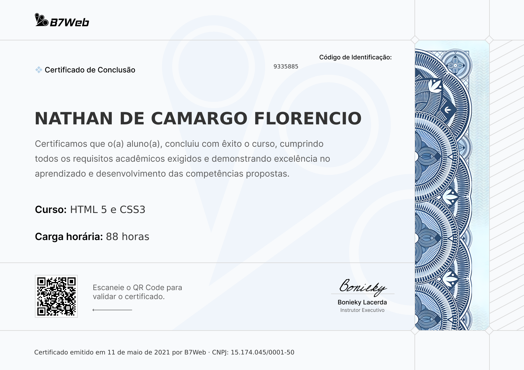 Este certificado foi emitido para Nathan de Camargo Florencio pela conclusão do curso HTML 5 e CSS3 em 11 de maio de 2021.