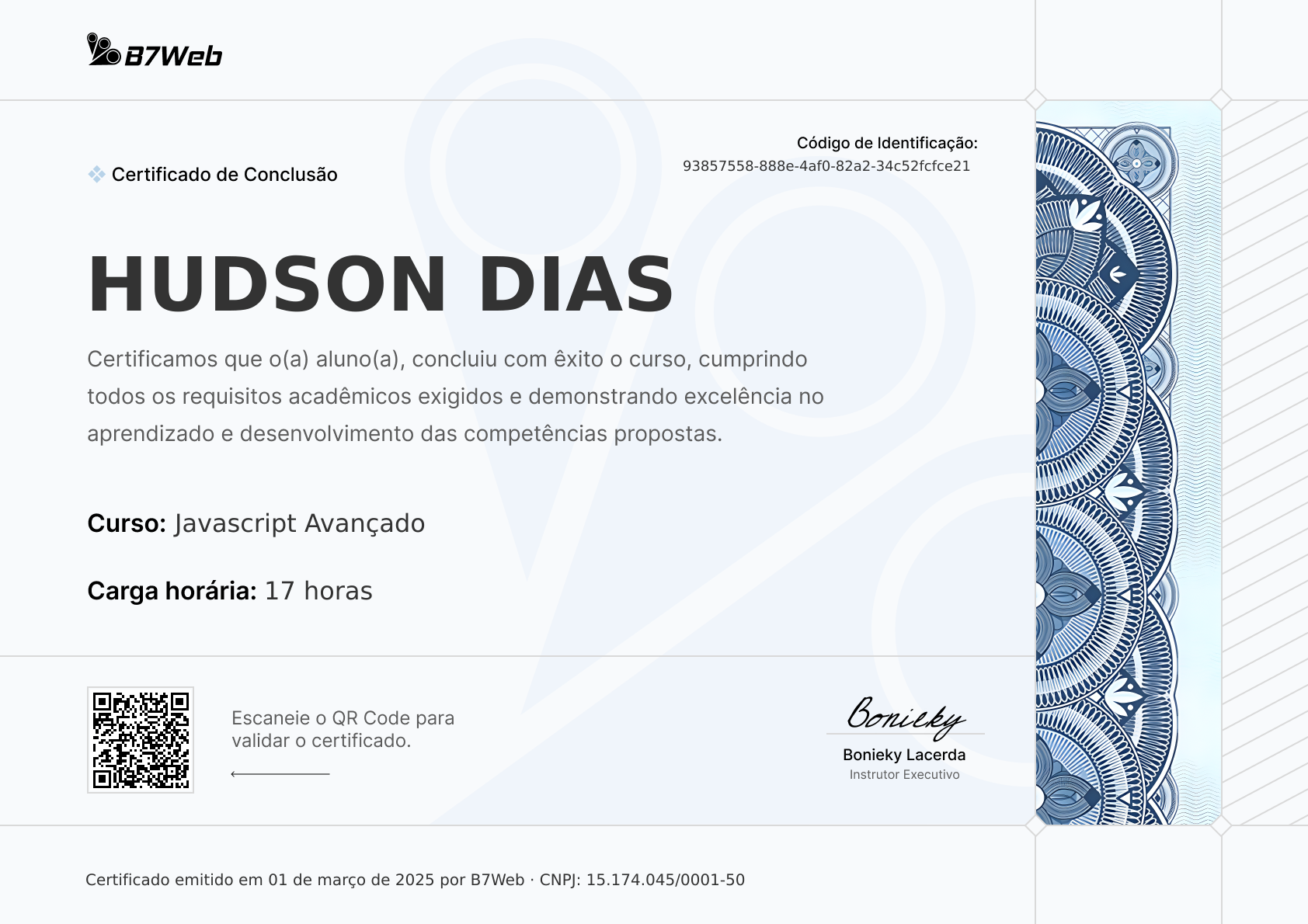 Este certificado foi emitido para Hudson Dias pela conclusão do curso Javascript Avançado em 01 de março de 2025.