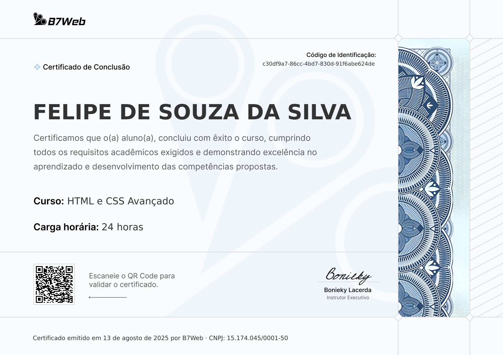 Este certificado foi emitido para Felipe de Souza da Silva pela conclusão do curso HTML e CSS Avançado em 13 de agosto de 2025.