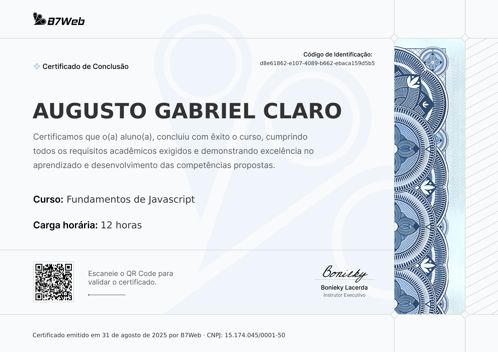 Este certificado foi emitido para Augusto Gabriel Claro pela conclusão do curso Fundamentos de Javascript em 31 de agosto de 2025.