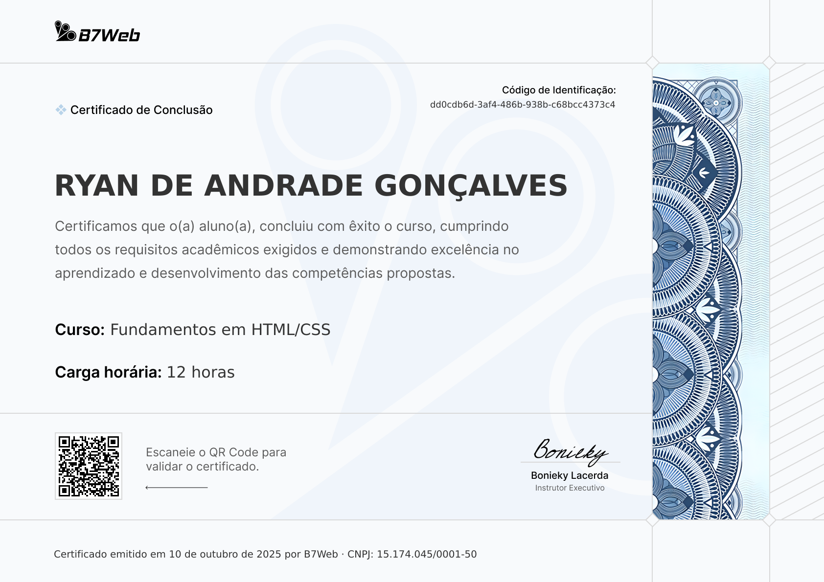 Este certificado foi emitido para Ryan de Andrade Gonçalves pela conclusão do curso Fundamentos em HTML/CSS em 10 de outubro de 2025.