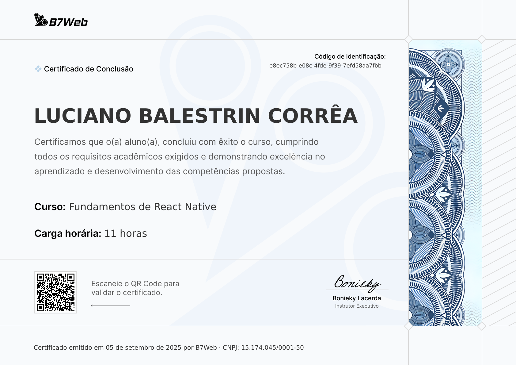 Este certificado foi emitido para Luciano Balestrin Corrêa pela conclusão do curso Fundamentos de React Native em 05 de setembro de 2025.